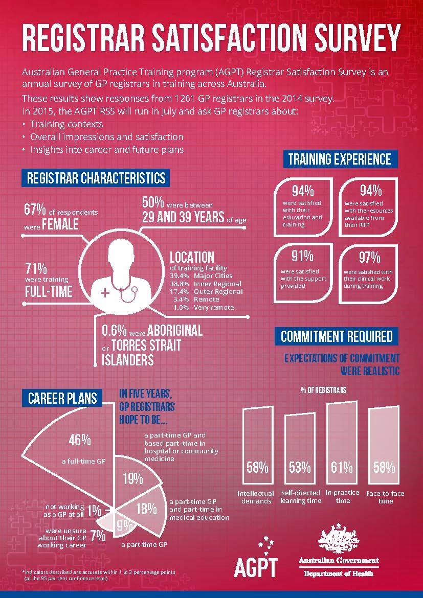 From July 2015, postgraduate doctors around Australia will be asked about their satisfaction with the quality of their training, training providers and career progression as part of the annual Australian General Practice Training (AGPT) Registrar Satisfaction Survey.